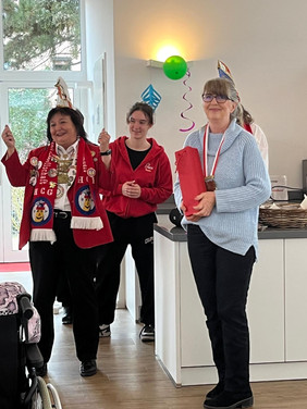 Auch am Faschingsdienstag wurde weiter gefeiert: Die Bewohnerinnen und Bewohner erhielten Besuch von der Jugendgarde der Hockenheimer-Carnevals-Gesellschaft 1954 e.V., die für ein schwungvolles Programm sorgte. Insgesamt 15 Kinder begeisterten mit mitreißenden Gardetänzen zur Faschingsmusik und zauberten den Seniorinnen und Senioren ein Lächeln ins Gesicht. Ganz besonders freuten sich alle Zuschauer und Zuhörer über die eigens verfasste, sehr treffende und empathische Büttenrede von Gabriele Uhrig-Biefel. Zum Schluss wurde Einrichtungsleiterin Elies Pastrik der traditionelle Faschingsorden verliehen, den sie stolz entgegennahm.